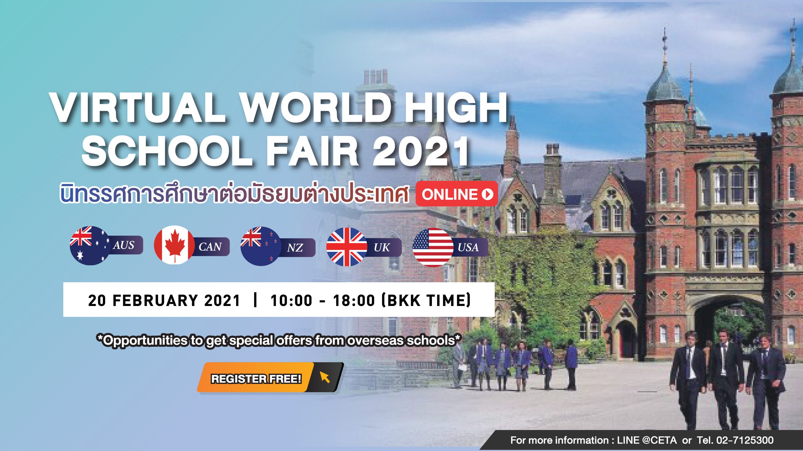 Virtual World High School Fair Jan 2021 CETA Virtual World High School Fair 2021 นิทรรศการศึกษาต่อมัยมต่างประเทศออนไลน์สุดพิเศษ โอกาสดีสำหรับผู้ปกครองและนักเรียนที่จะได้ทำความรู้จัก พูดคุยกับโรงเรียนชั้นนำและสถาบันต่างๆ จากหลากหลายประเทศทั่วโลก พร้อมร่วมกิจกรรมต่าง ๆ มากมาย |