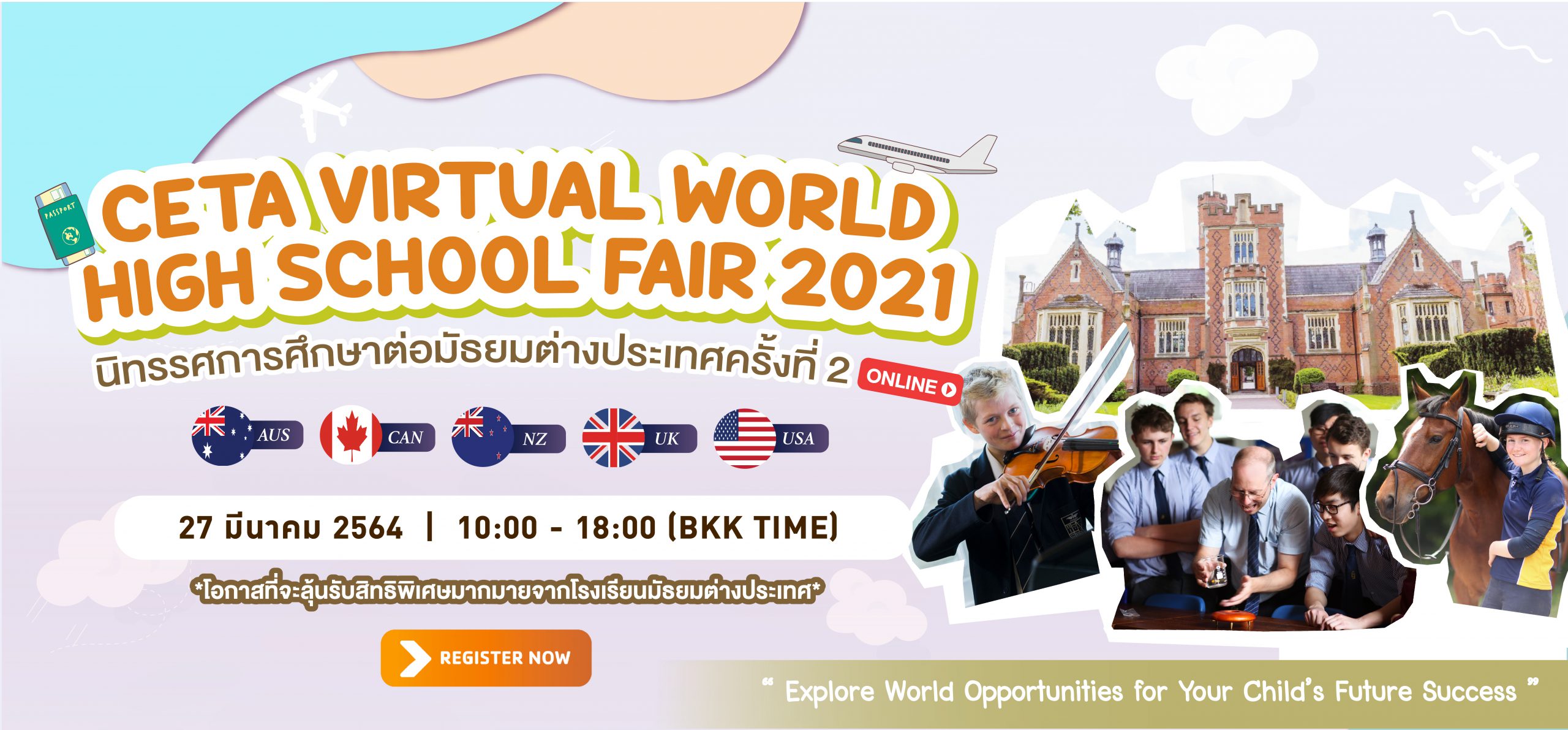 Virtual World High School Fair Mar 2021 CETA Virtual World High School Fair 2021 นิทรรศการศึกษาต่อมัยมต่างประเทศออนไลน์สุดพิเศษ โอกาสดีสำหรับผู้ปกครองและนักเรียนที่จะได้ทำความรู้จัก พูดคุยกับโรงเรียนชั้นนำและสถาบันต่างๆ จากหลากหลายประเทศทั่วโลก พร้อมร่วมกิจกรรมต่าง ๆ มากมาย |